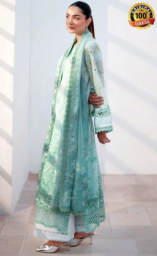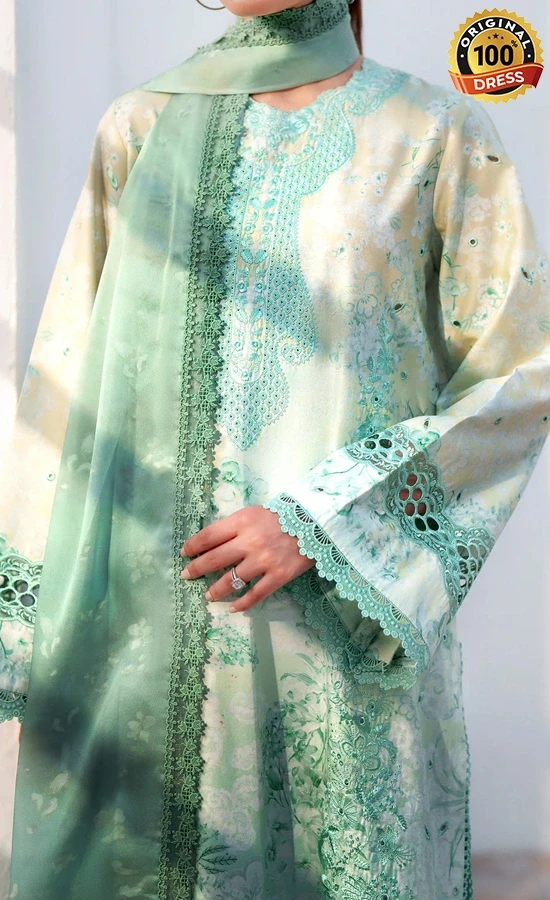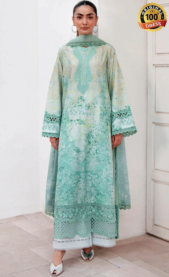 • Digital printed embroidered front 1 pc green printed lawn